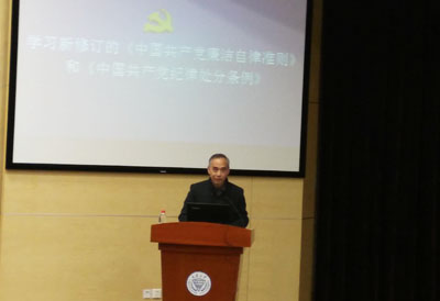 • 2015年12月10日,机关党委在国际会议厅306室举行专题学习研讨会,启动机关党委“守纪律、讲规矩、争做合格共产党员”主题教育系列活动。校部机关各支部书记、支部委员、党员代表、第一期机关青年素质拓展培训班学员集体参加了本次研讨会,会议由机关党委委员、党委学生工作部部长严太华主持。